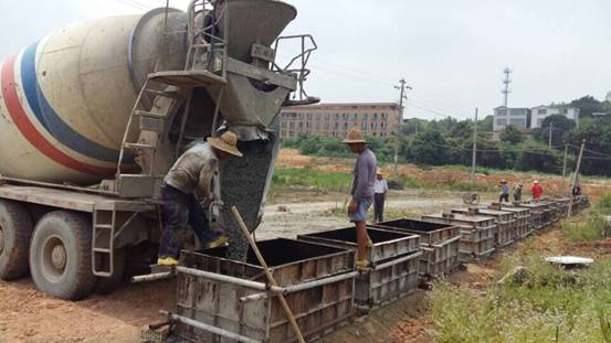 图一:工人们正在把混凝土打入钢模中。
