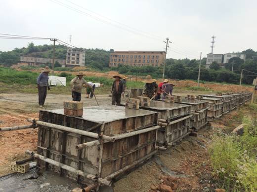 2016年6月15日,在公司领导陆虹任总经理的部署下,由组长黄坚,组员唐磊、劳正彬等几位同事成立的桩基配重块、钢梁制作工作实施小组到现场指导作业,炎热的天气阻挡不住工人们热火朝天的工作热情,现场大约需要制作1700多组配重块,规格为:1.5米*1米*0.8米,理论重量达3.85Kg/m³,目前配重块现已完成480组。