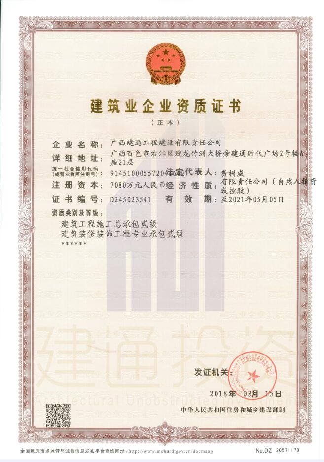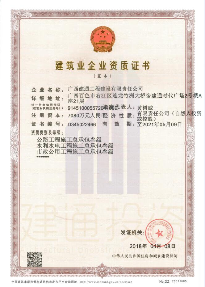 2018年04月08日,半岛web版登录入口集团旗下子公司广西建通工程建设有限责任公司成功增项水利水电工程施工总承包叁级资质并取得证书,目前建通建设公司所拥有的资质及等级为: