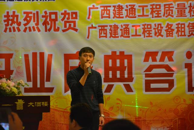 随后,集团副董事长兼桂昌公司总经理、设备租赁公司总经理黄树威也对开业活动做出了庆典致辞。他表示:广西建通工程设备租赁有限责任公司是广西半岛web版登录入口集团于2013年4月注资100万元成立的具有独立法人资格的子公司,业务范围包括各种建筑设备、机械设备租赁的专业租赁公司,目前主要服务于百色市场。一年多来,设备租赁公司在集团的正确领导下,以提供“专业、迅速、安全”服务为目标,着重营造集安装、拆除、维修于一体的高素质员工队伍,先后参与了百色地区多项重点大型工程建设,与一批优秀的建筑企业建立了良好合作关系。现公司拥有全新卡特320D挖掘机一台、外架钢管1000吨,扣件9万套及相关机械设备,全部用于建筑工地的施工生产需求。2015年建通设备租赁公司将全心全意为客户服务,急客户之急、想客户所想,力争做到让每一位合作伙伴用得省心!用得称心!用得放心!